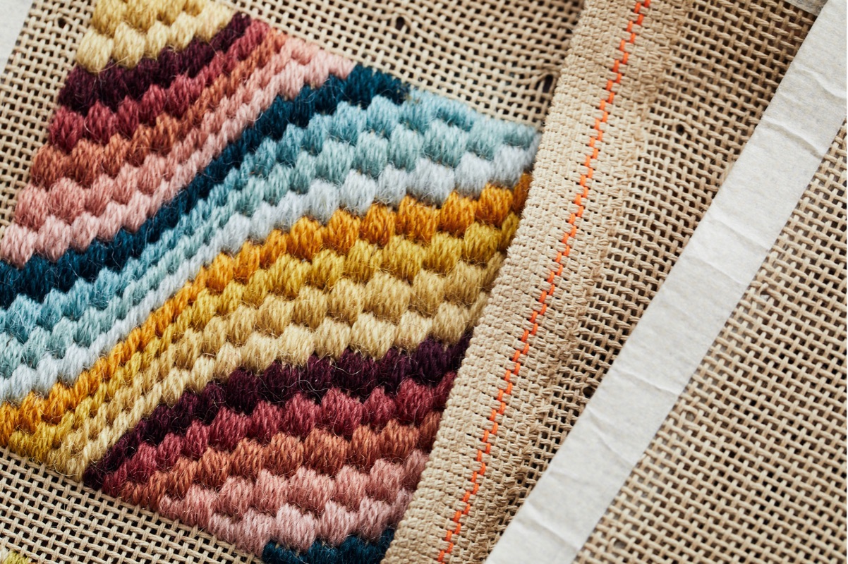 Defined as counted thread embroidery on a canvas foundation that is entirely covered in stitches, needlepoint’s origins date back to the Middle Ages.