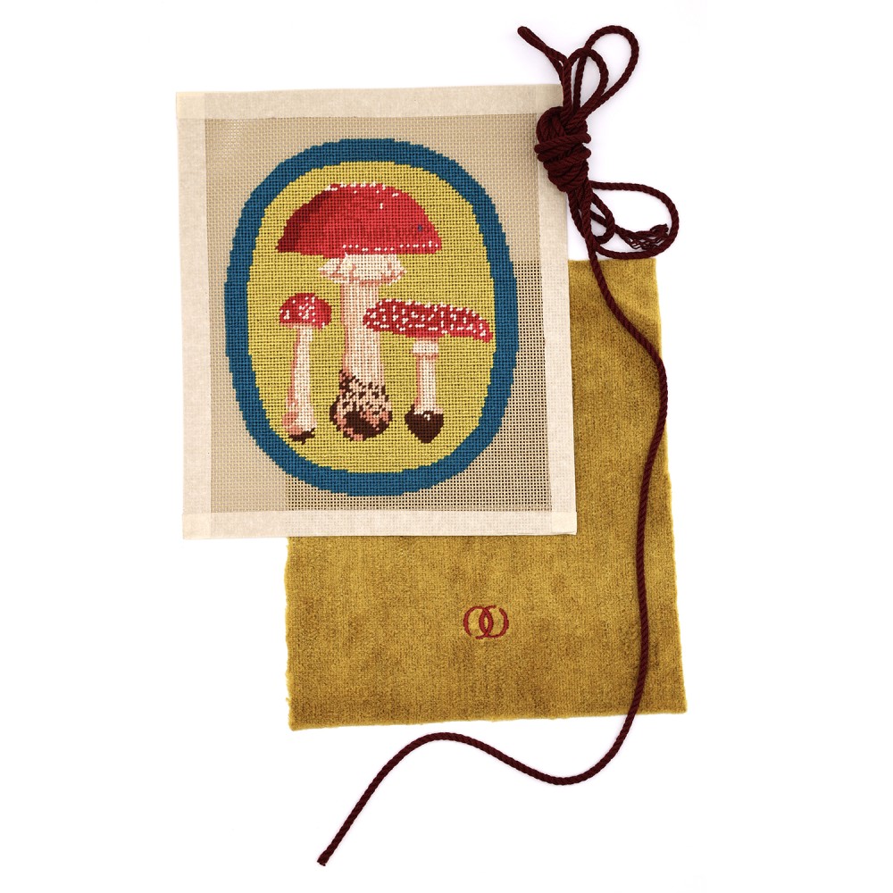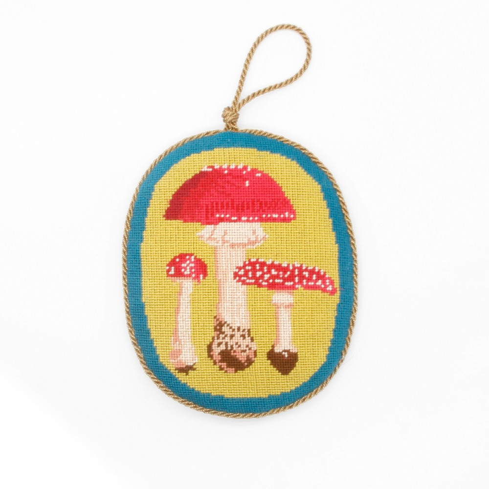 A cluster of Fly Agaric mushrooms against a lemon and teal backdrop.