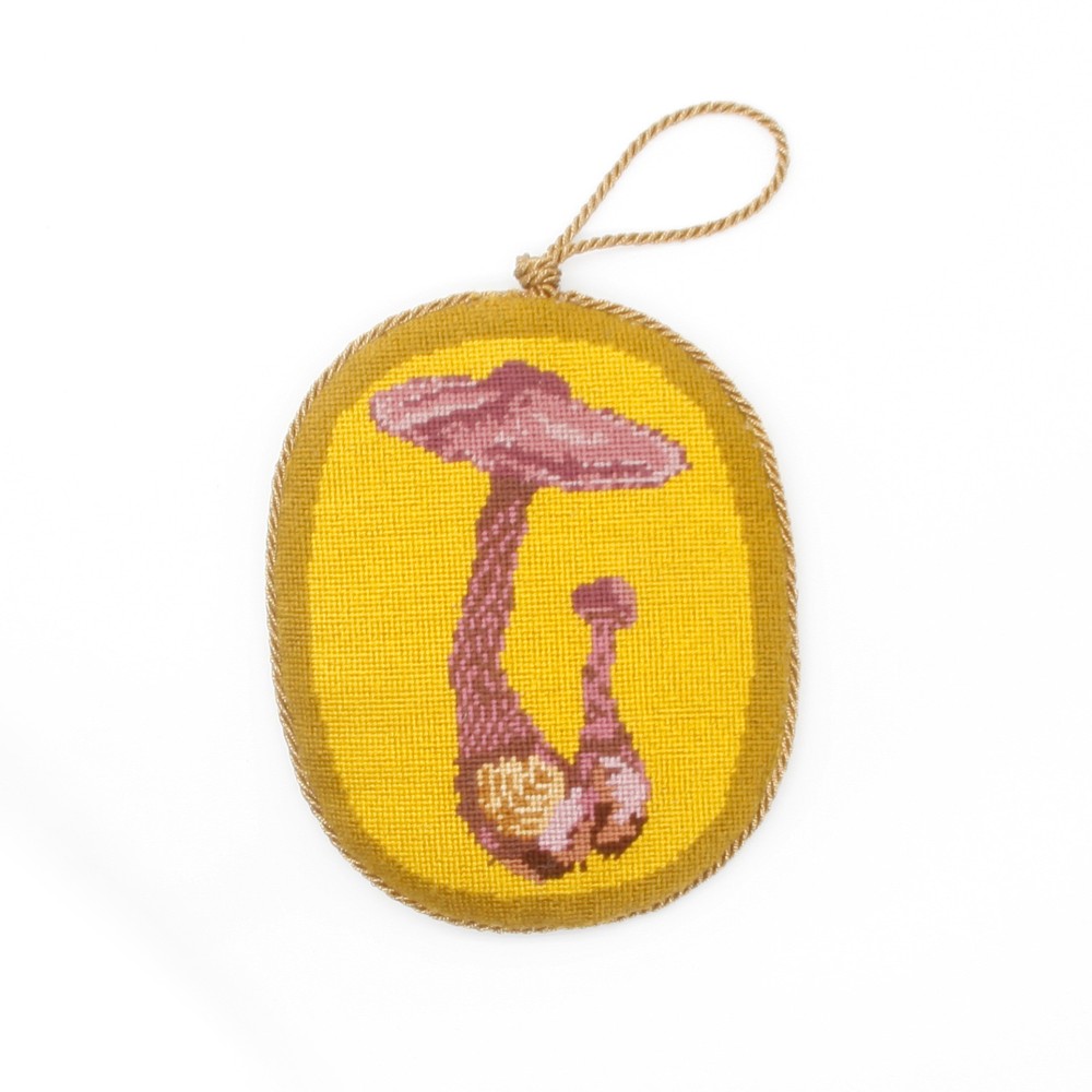 A pair of Violet Webcap mushrooms against a yellow and gold backdrop.