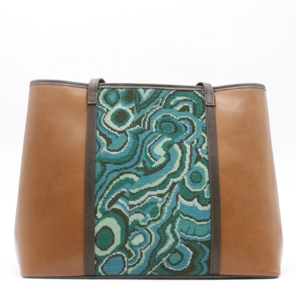 Leather tote with needlepoint panel